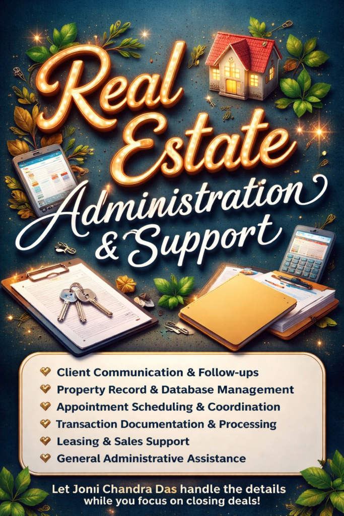 At Joni Chandra Das, we streamline real estate operations to keep your business organized, efficient, and client-focused. Our professional administration and support services ensure every detail—from client communications to property records—is handled with precision and care.